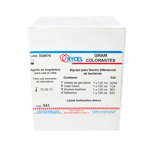 Equipo de Colorantes para Tinción Gram - Hycel (REF 541) Características Tipo: Equipo de colorantes para tinción diferencial de bacilos Gram positivos y negativos. Incluye: Violeta de genciana, yodo Gram,...