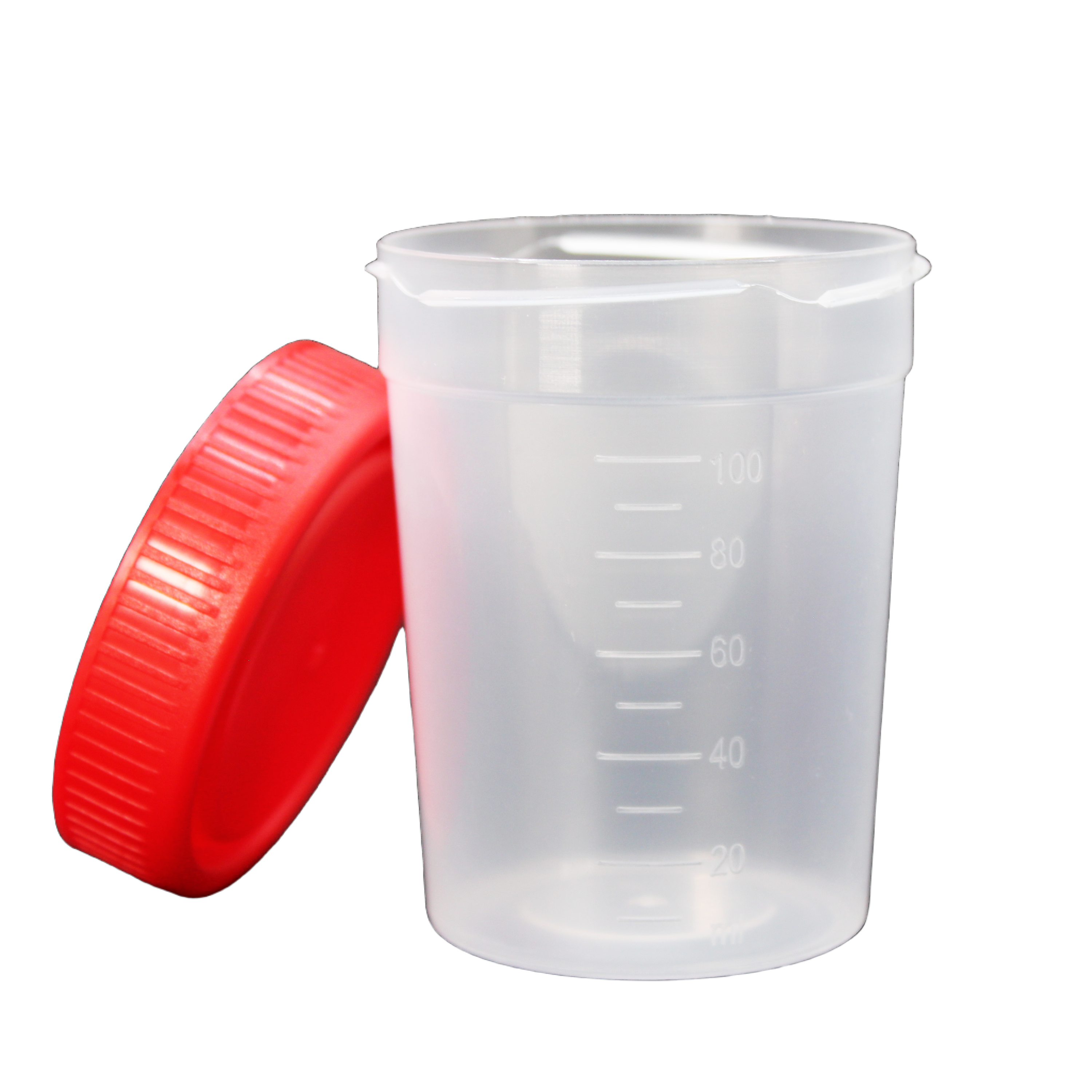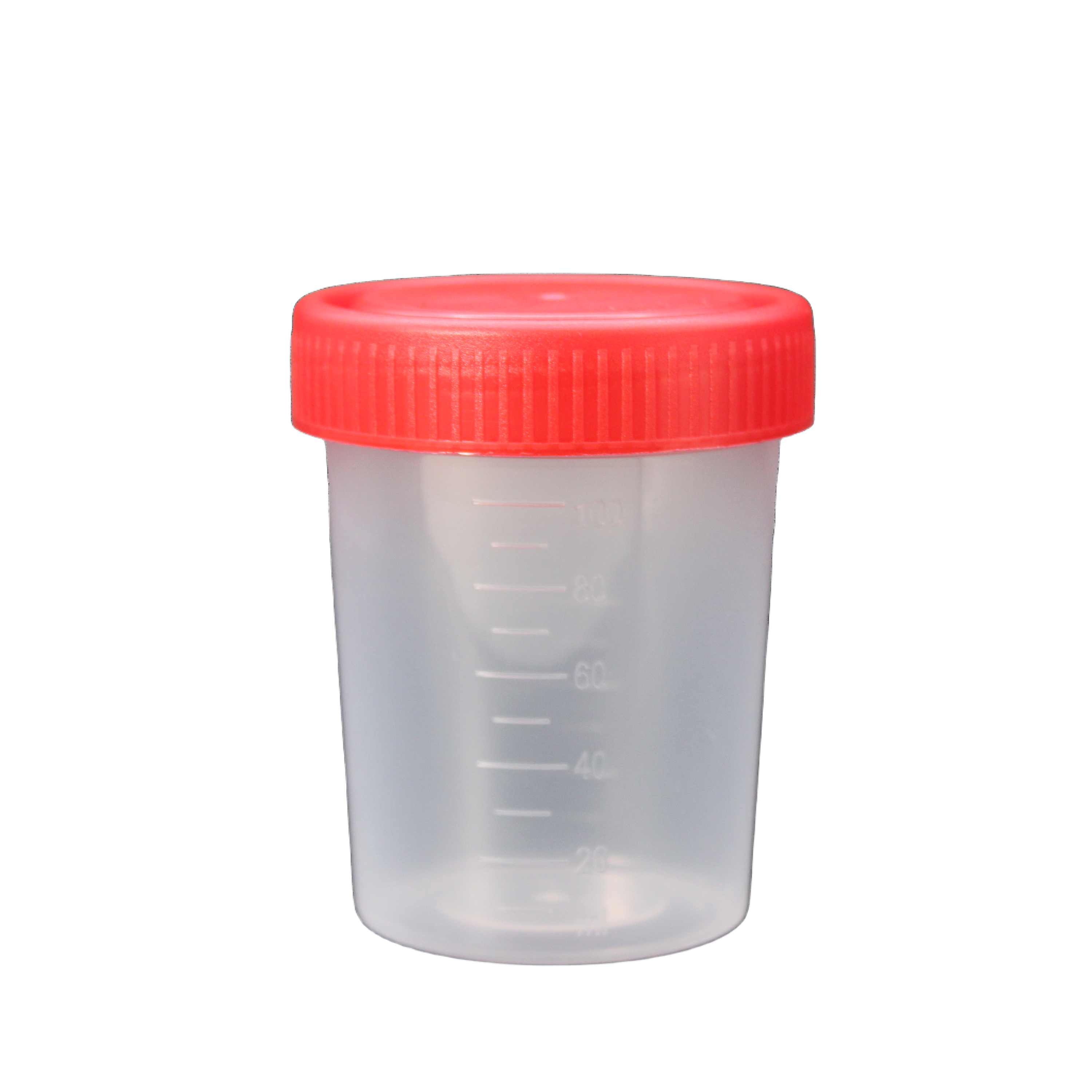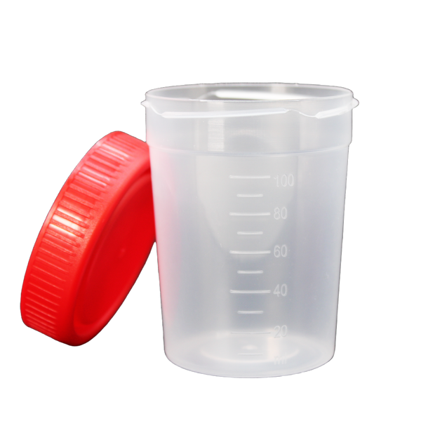 Vaso recolector estéril de 100 ml con tapa roja, fabricado con plástico resistente y seguro para uso médico. Diseñado para la recolección, transporte y almacenamiento temporal de muestras biológicas líquidas en entornos clínicos y de laboratorio, garantizando higiene y prevención de contaminación.