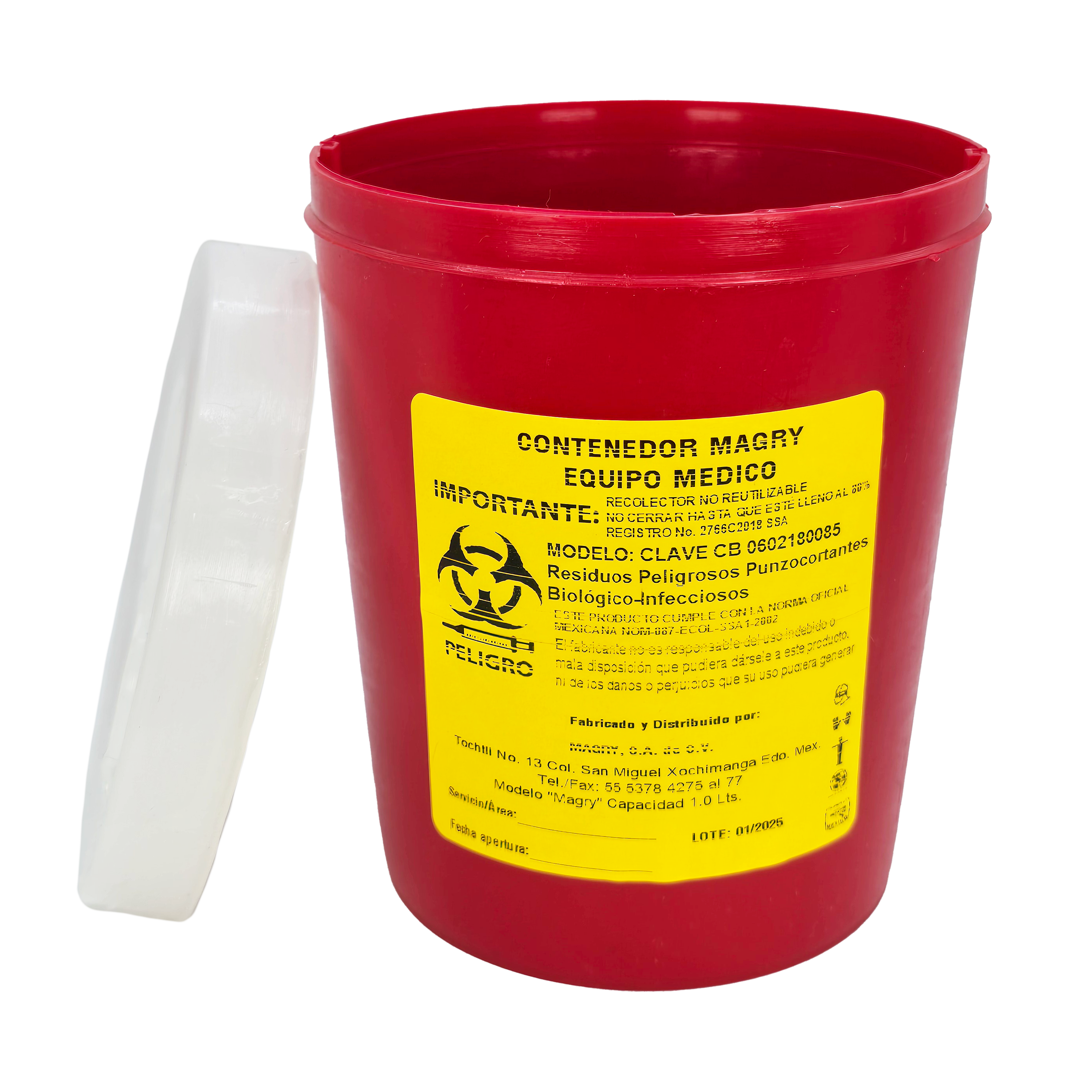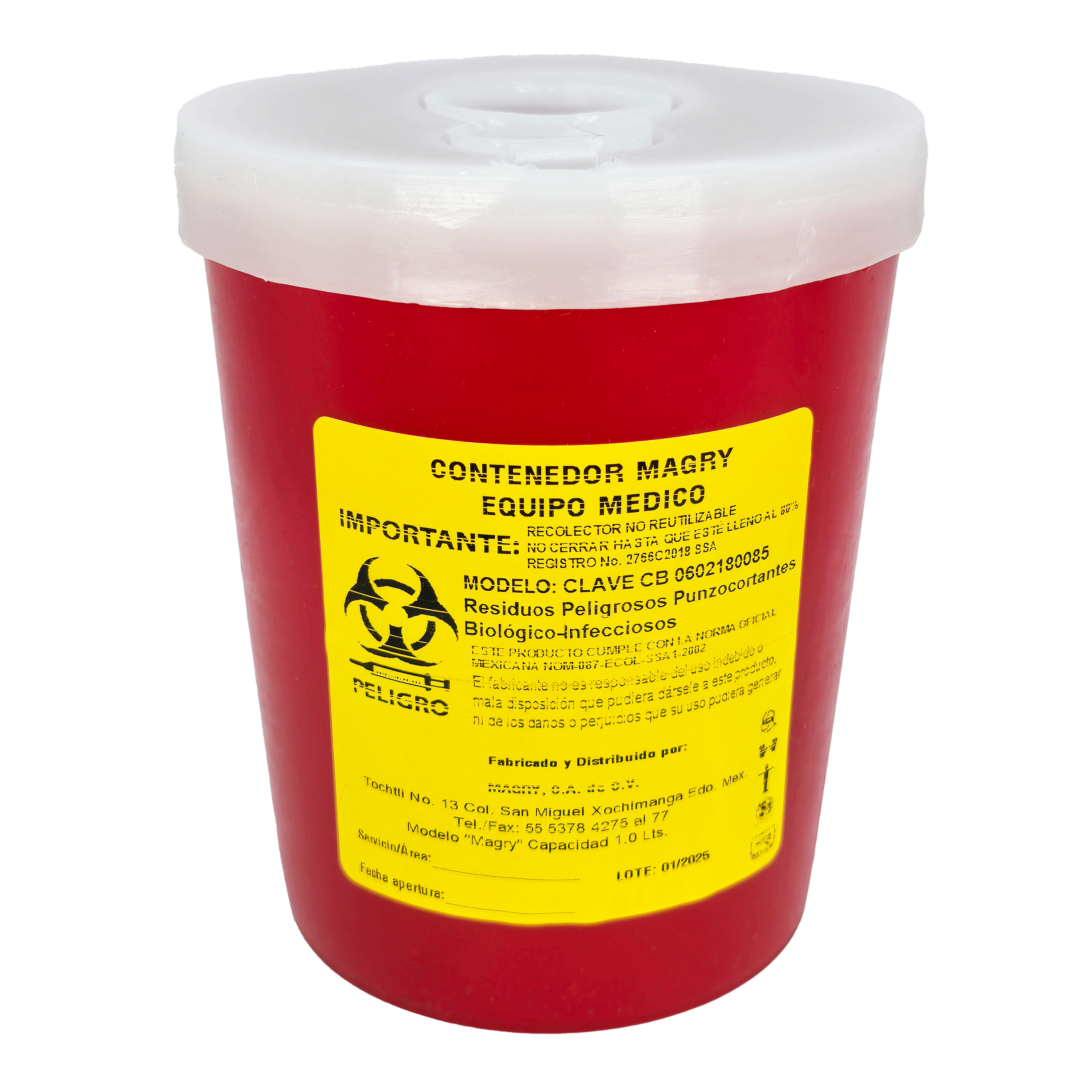 El contenedor Magry CB 0602180085 para residuos peligrosos punzocortantes de 1.0 L está diseñado para la recolección segura de agujas, bisturís y otros objetos corto punzantes contaminados. Fabricado en material rígido y resistente a perforaciones, cuenta con tapa de cierre seguro que evita derrames y accidentes, garantizando un manejo adecuado de desechos biológicos en hospitales, clínicas, laboratorios y consultorios médicos. Mencionando su función principal, materiales o beneficios.