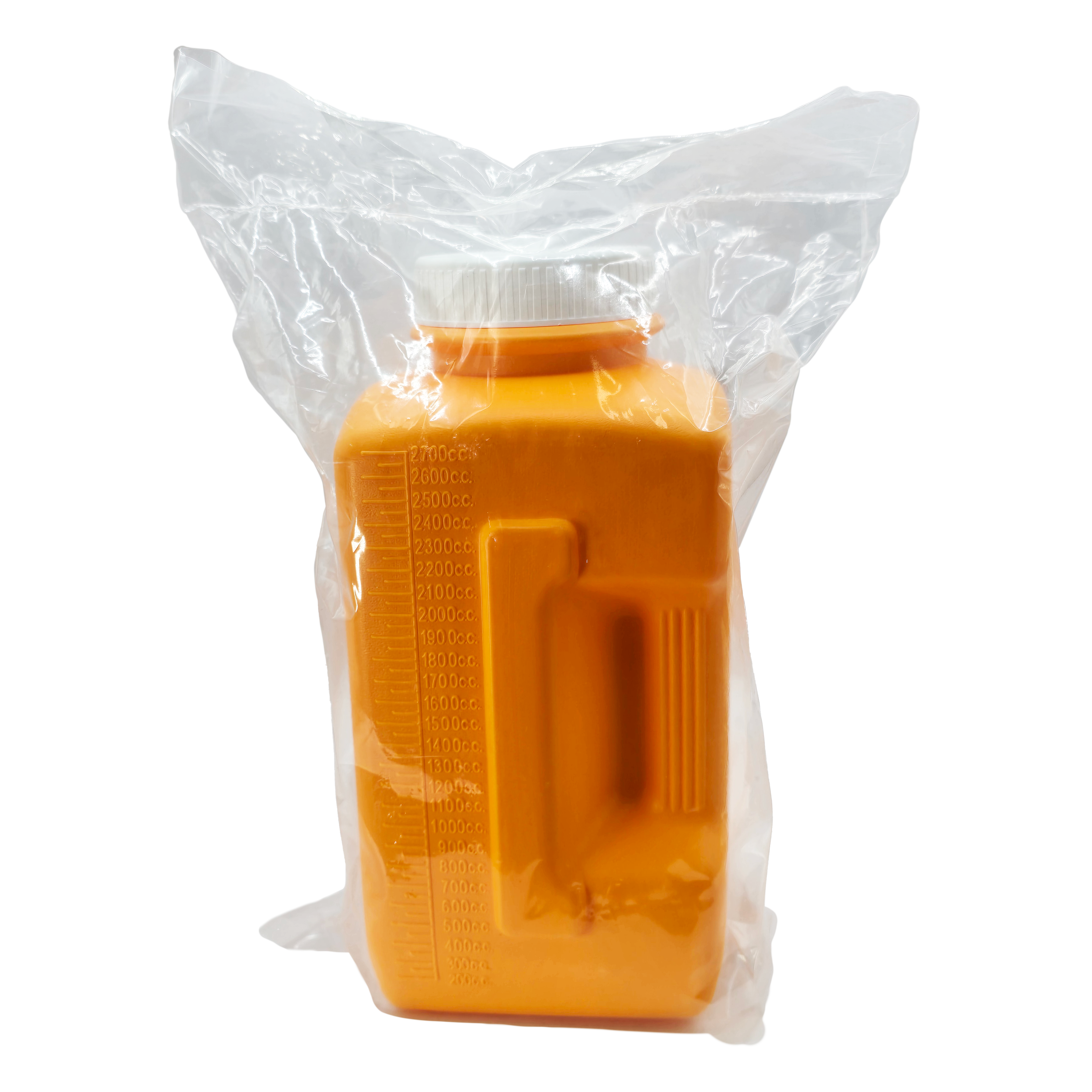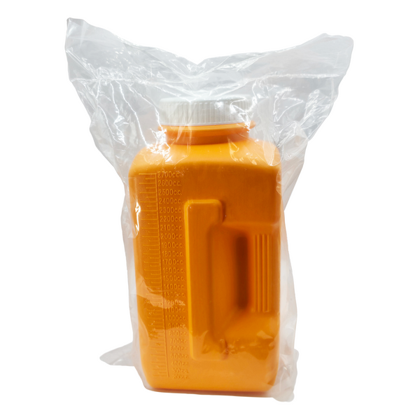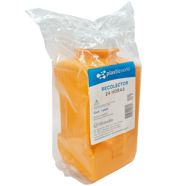 Recolector plástico de 3.5 litros para recolección de muestras de orina en un período de 24 horas, diseñado con material resistente e impermeable. Cuenta con tapa segura para evitar derrames y facilitar el transporte y almacenamiento en entornos clínicos y de laboratorio, garantizando higiene y precisión en la recolección.